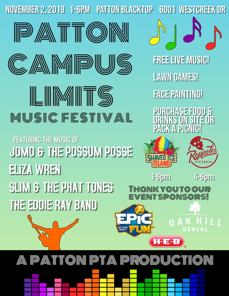 We are so excited to announce the first ever Patton Campus Limits Music Festival! Join us on Saturday, November 2nd for a fun afternoon of FREE live music with bands all featuring Patton parents and family! Invite your friends, family and neighbors to come hang out and enjoy a piece of the Austin music scene right here in our own neighborhood! Bring your lawn chairs and blankets and pack a picnic or purchase food for sale on site. We’ll have Cornhole, giant Jenga and giant Connect Four if games are your jam! Come get your groove on at Patton Campus Limits!
