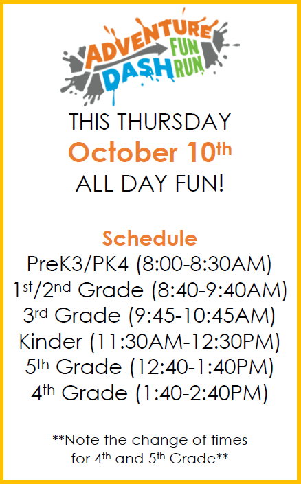 Check out the schedule for the Adventure Dash Fun Run tomorrow. Thank you for supporting this Principal fundraiser – Patton families have raised more than $43,000! ❤️