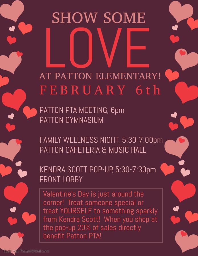 Valentine’s Day is just around the corner; treat someone special or yourself to something sparkly from Kendra Scott! Join us February 6 between 5:30-7:30 pm for a special Kendra Scott pop-up at Patton. When you shop the pop-up 20% of sales benefit Patton PTA! S