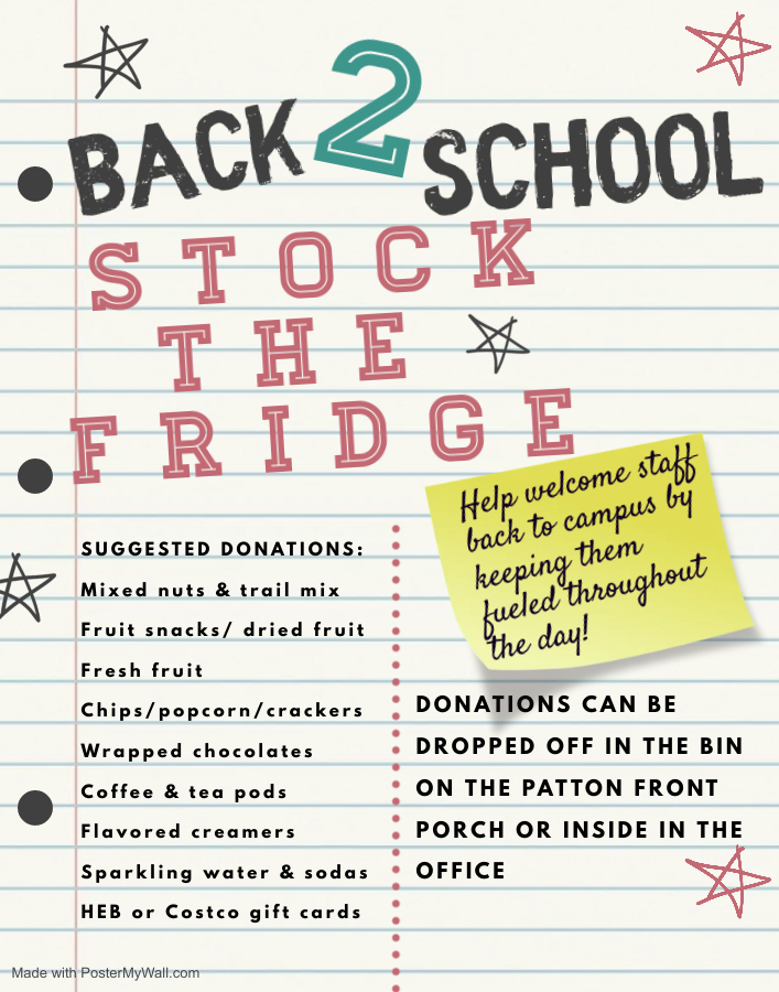 Thanks to everyone who has brought snacks and drinks so far for our staff! Keep the donations coming for our Stock the Fridge drive! Patton staff appreciate these small gestures so much and this is a simple way to show gratitude to our hard-working teachers!