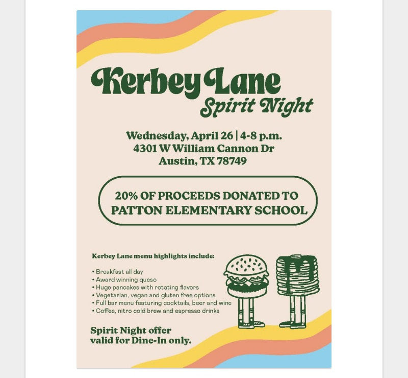 - Kerby Lane Spirit Night: Wed, April 26th