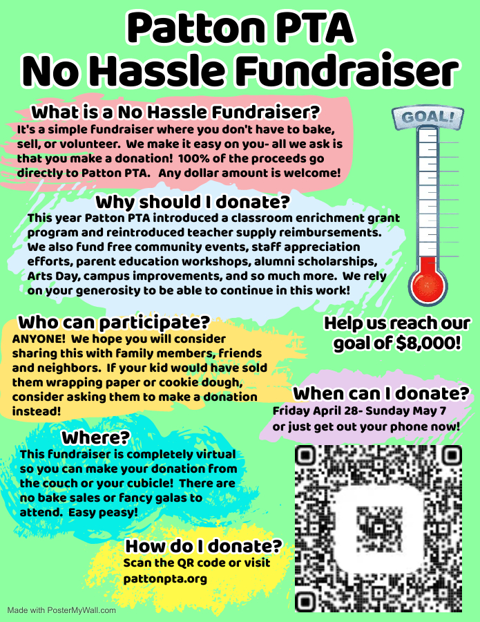 Our no-hassle fundraiser is on now and continues through May 7th. No selling or other hoops – just spread the word! 100% of proceeds to directly to the Patton PTA!! Click here to donate https://square.link/u/969NxQSv