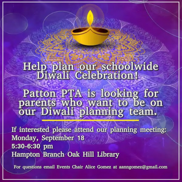 - Mon, Sept 18th, 5:30-6:30pm @ Hampton Branch library: Help plan our school-wide Diwali Celebration!