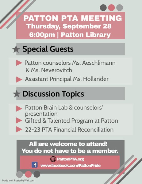 - Thurs, Sept 28th, 6pm @ Patton Library: 2nd PTA Meeting of the Year (Meet the Counselors, Learn about the Gifted & Talented program, and more)