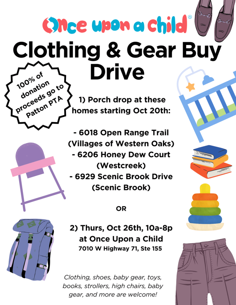 - Oct 20-26th 10am-8pm: Clean Out Your Closets for Patton! Early drop-off at volunteer homes 10/20 – 10/25. Drop-off at Once Upon a Child on 10/26. (see flyer for details)