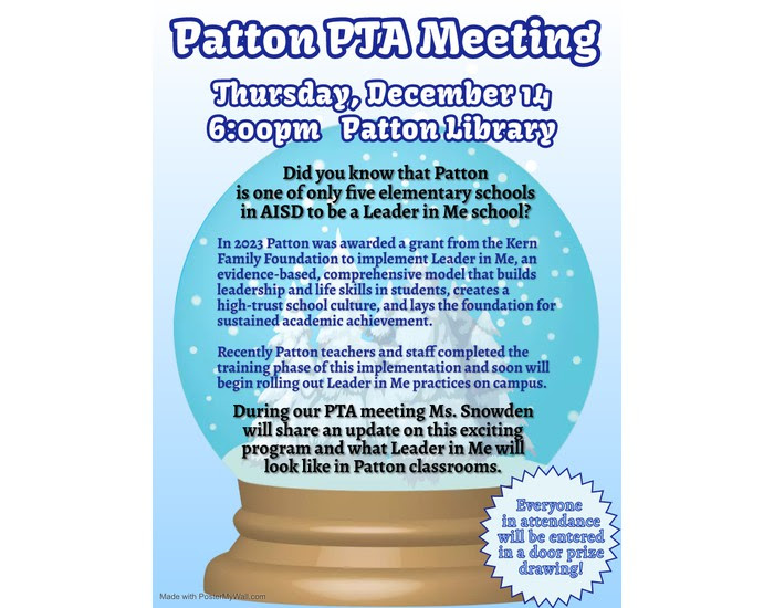 - December PTA Meeting: Thurs Dec 14th @ 6pm in the Patton Library
