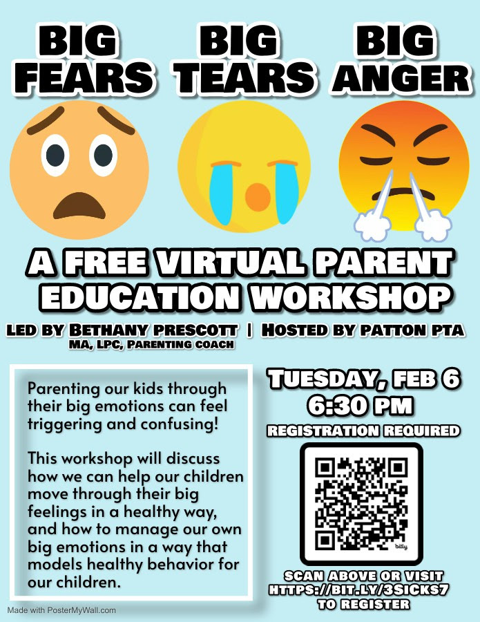 - Tue, February 6th @ 6:30pm: Big Feelings Virtual Parent Workshop