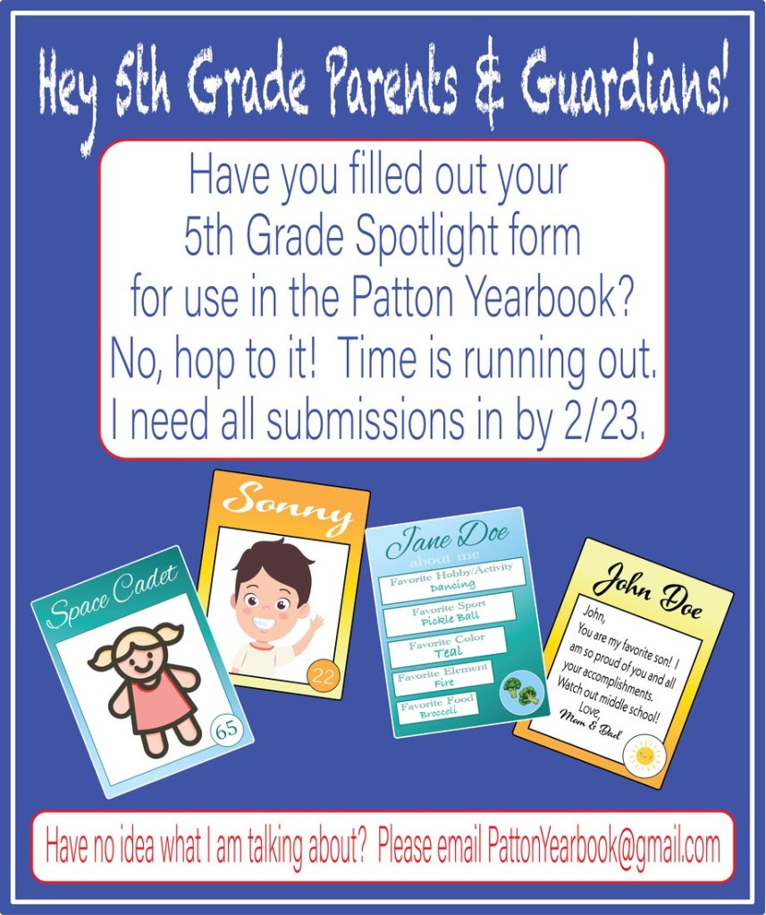 - 5th Grade Spotlight submissions for the yearbook are DUE FEBRUARY 23rd!!
