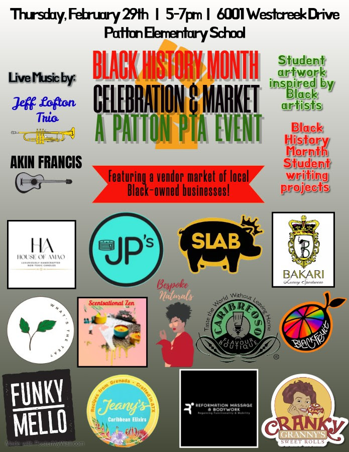- Thursday, Feb 29th 5-7pm @ Patton – Black History Month Celebration & Market