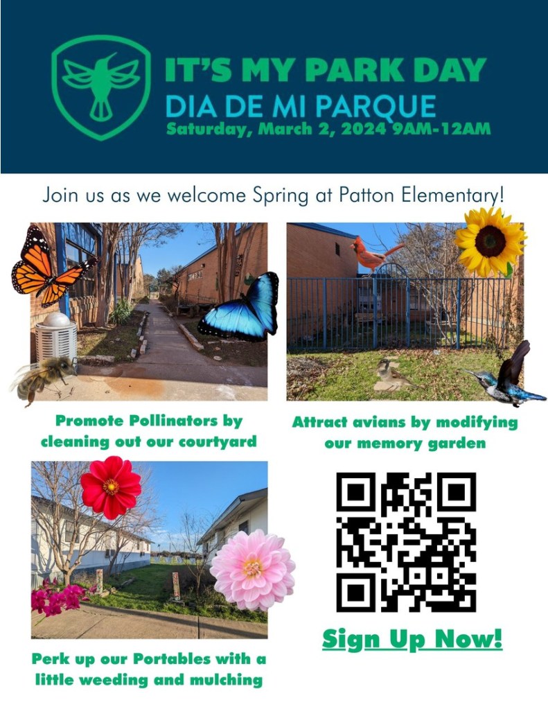 - This year Patton Elementary will be an official site for Austin Parks Foundation It’s My Park Day! Plans include sprucing up our butterfly garden and creating a bird sanctuary in one of the back courtyards. Use the link below to sign up as a volunteer on March 2nd from 9am-12pm. Feel free to share with friends and family members, as well!